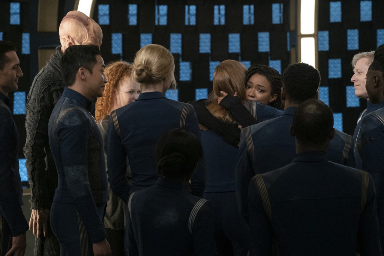 While the plot of “People of Earth” is about the crew’s return to the birthplace of Starfleet, the heart of this story really lies in the reunion of Michael and the rest of the crew. We begin more or less where last week’s cliffhanger left off, as Michael beams aboard after dropping the bomb that she arrived to the 32nd century a full year before her ship. It’s an emotional reunion and, at first, that joy is simple. It doesn’t matter that the crew hasn’t seen Michael in days while its been a whole year for her. For a little while, all that matters is that they’re together.