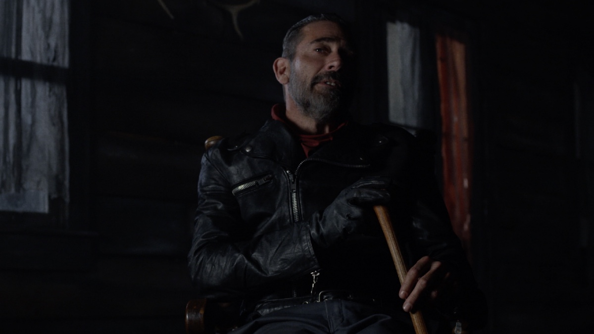 But it’s not the gates of Alexandria that Negan is demanding to be let into but rather the real Negan’s own psyche. This Negan is but a shade of Negan’s past. The hallmarks are undeniable: black leather jacket, red scarf, slicked back hair, and a devilish grin. The Negan who has matured over the past several years, first in captivity in Alexandria, and then on his feet in a war against the Whisperers, can only sit quietly in front of the fire trying to ignore him.
