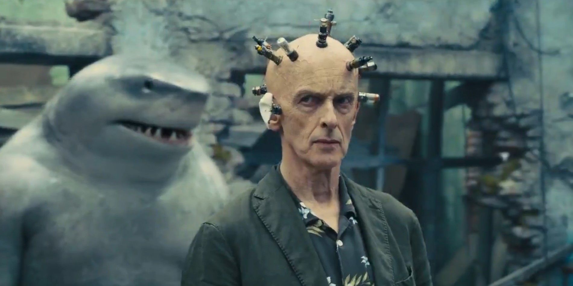 “The character is definitely done justice,” Robbie tells us of Capaldi’s work, adding that The Thinker (along with King Shark) was one of the characters she was particularly excited to see brought on for The Suicide Squad. The character first appeared in DC Comics (All-Flash #3) back in 1943. Also known as Clifford DeVoe, The Thinker got his alternate moniker because of the “thinking cap” he uses to augment his intelligence. Originally, the cap was a helmet that beamed IQ-boosting rays into DeVoe’s brain. Later in canon, The Thinker’s cap has taken the form of implants that bore directly into DeVoe’s bald head—The Suicide Squad is going with this latter depiction, which may be a missed opportunity to sell The Thinker bike helmets. The character made an on-screen appearance as a main villain in Season 4 of The Flash, but Capaldi’s turn in The Suicide Squad will be the first time The Thinker has been brought to the big screen.