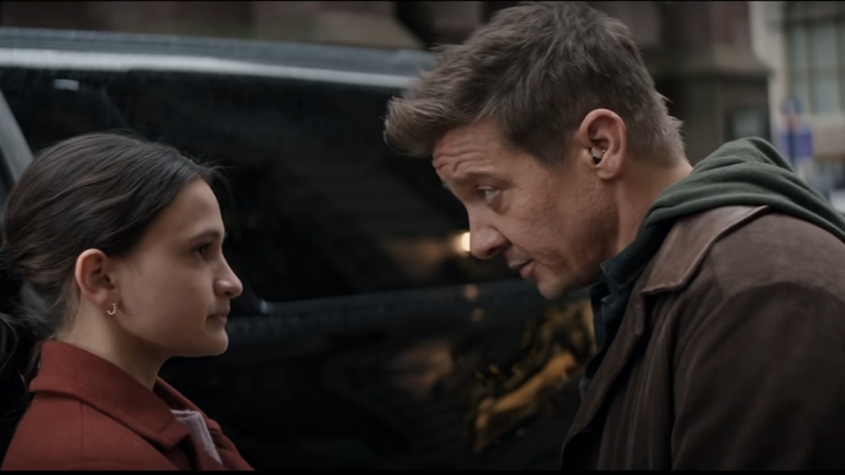 Jeremy Renner as Clint Barton wearing a hearing aid in Marvel's Hawkeye
